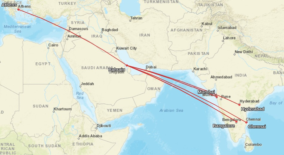 Οι πτήσεις είναι προς Χαϊντεραμπάντ, Μπανγκαλόρ, Μουμπάι, Τσενάι (Hyderabad, Bengaluru, Mumbai, Chennai)