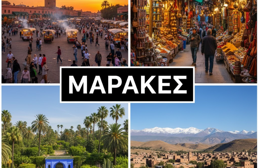 Το Μαρακές, γνωστό ως η “Κόκκινη Πόλη”, είναι μια έκρηξη αισθήσεων στο έδαφος του Μαρόκου. Στην καρδιά της, η Πλατεία Τζεμά αλ-Φνά ζωντανεύει με απασχολητές, ακροβάτες και πωλητές, δημιουργώντας μια μαγευτική ατμόσφαιρα, ιδιαίτερα το απόγευμα και το βράδυ. Το Μεδίνα, Μνημείο Παγκόσμιας Κληρονομιάς UNESCO, με τα σοκάκια και τις αγορές του (σουκ), είναι ο ιδανικός τόπος για να χαθεί κανείς ανάμεσα σε αρώματα μπαχαρικών, χειροποίητα δέρματα και φωτεινά λάμπα.